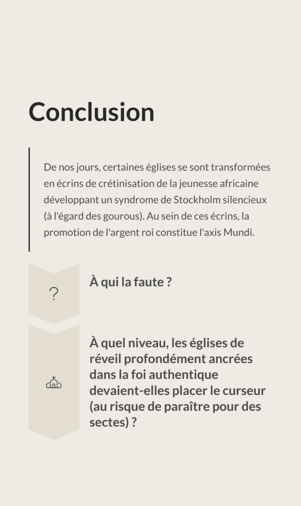 Durant ces dernières décennies, l’on assiste à un foisonnement d’églises évangéliques voire de réveil au sein des sociétés occidentales et surtout africaines. Si certaines congrégations restent centrées autour de la christologie, d’autres ont décidé de faire du temple, un lieu de commerce. Être riche en vue de Dieu (Evangile selon Saint-Luc au chapitre 12) a été dévoyé de son sens pour ces dernières. De plus, ces communautés se sont muées progressivement en laboratoire de massification des consciences et surtout de manipulation des masses avec à la clé, la promesse d’une destinée glorieuse entre finances abondantes et développement personnel. L’or et l’argent n’appartiennent -il pas à Dieu ? Après tout, Salomon, David pour ne citer que ceux-là n’ont-ils pas prospéré à tous égards ?
